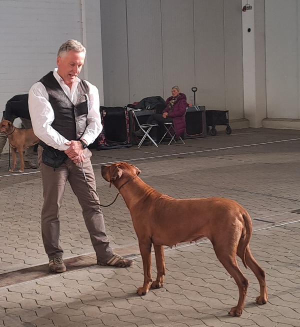 "Jugendlicher , sehr harmonischer Typ, obere & untere Linie & Ridge vorzüglich, typischer Kopf, tiefe Brust, Winkelungen vorzüglich, Bewegung frei, freundliches Wesen"