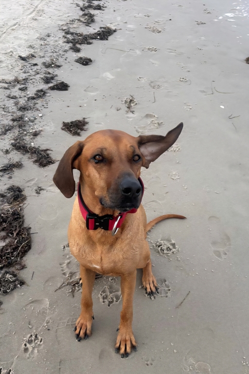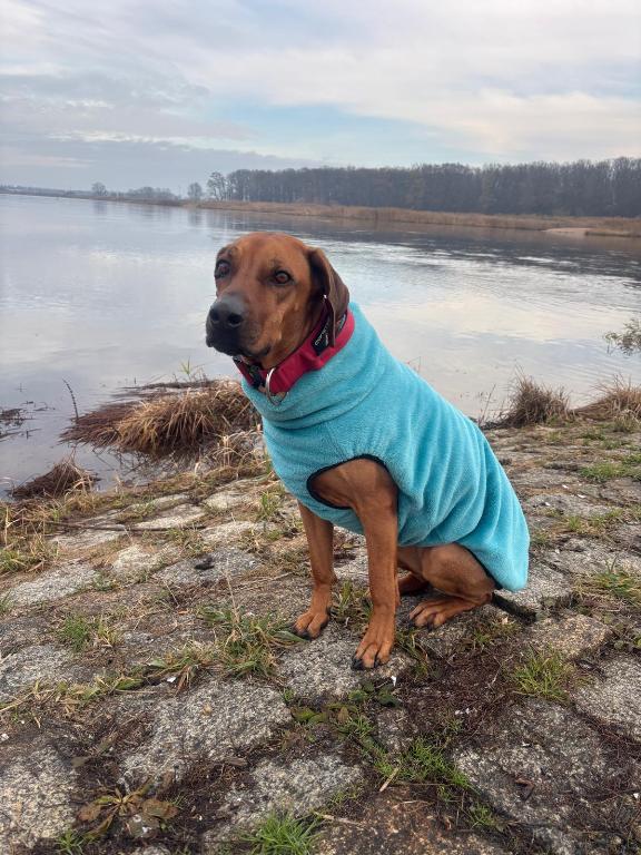 Eyka und Freundin Abby grüßen vom Helenesee. Bei 14°C kann man den Strand schon genießen.