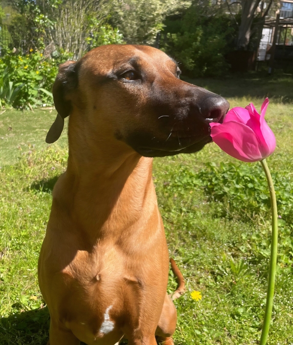 "Hallo, ich bin Elmo. Wir wohnen auch in Berlin - noch! Anfang Mai ziehen wir aber um. Frauchen und Herrchen haben versprochen, dass wir da einen Garten haben! Bis dahin werde ich ihnen die Bude auf den Kopf stellen! Ich lebe ganz nach dem Motto: wer zuletzt bremst ist schneller unterwegs und schneller am Ziel!"