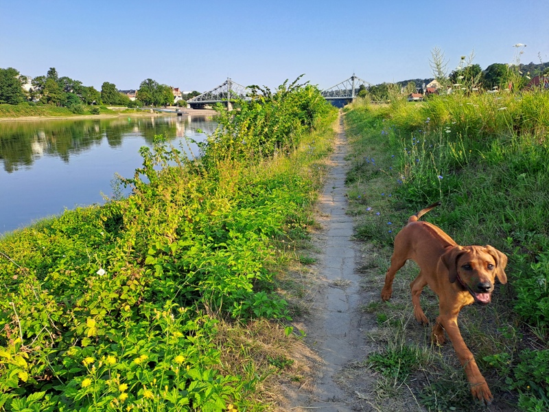 Aber auch "Einzeltraining" für Umoja gibt es weiter. An der Elbe, mit ganz unterschiedlicher Ablenkung, üben wir regelmäßig den Abruf an der langen Leine.