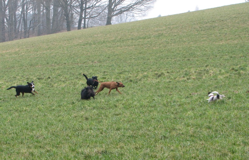 Für einige 4-Beiner waren die glatten Fußböden gewöhnungsbedürftig, aber der "Gruppenzwang" half, die Unsicherheiten zu überwinden.