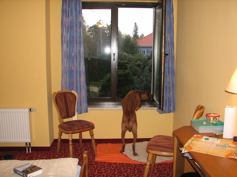 Frauchen hatte sich einen Tag frei organisiert und so waren wir schon gegen Mittag am Ziel angekommen. Nach nur 45 Autominuten erreichten wir Gohrisch, in der Sächsischen Schweiz. Wir bekamen das selbe schöne Zimmer wie im letzten Jahr und ich entschied mich gleich für den kuscheligen Platz an der Heizung.