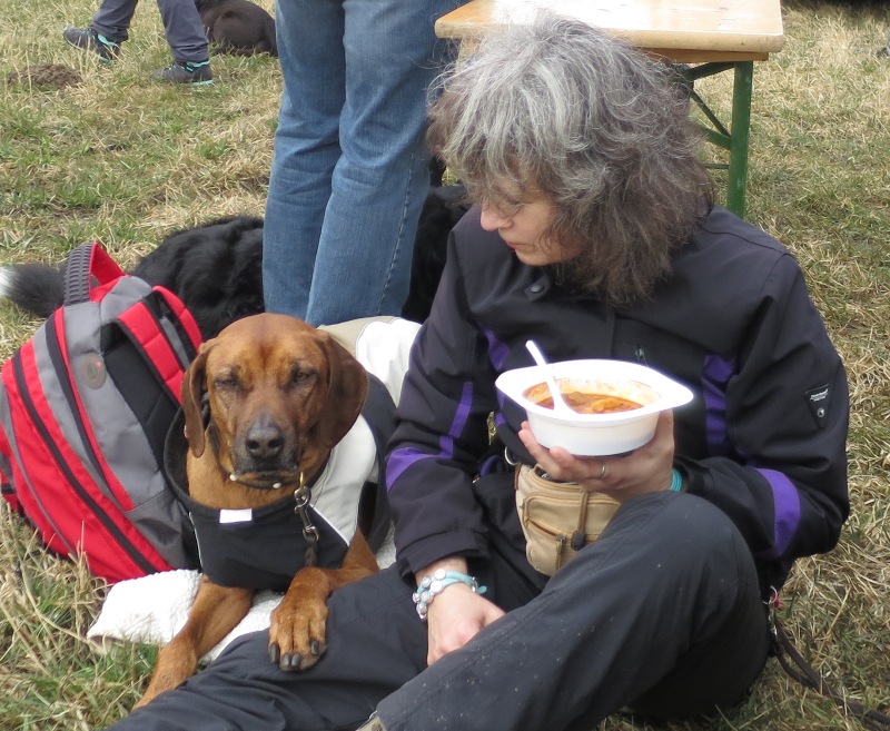 Mitten zwischen den Bäumen wehte dann ein leckerer Duft zu uns herüber und wies den Weg. Als Belohnung für die Suche, gab es dann für die Zweibeiner Würstchen, Brötchen, Suppe und Glühwein und ... MIR IST KALT!!!!