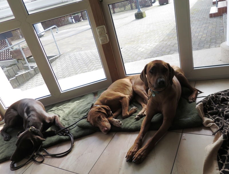Nach dem Spaziergang, mit einigen Suchspielen, kehrten wir in den Margarethenhof zurück und dort war schon richtig was los. Etliche meiner Kumpels, waren mit ihren Zweibeinern eingetroffen. Die Rudelchefs tranken erst einmal zusammen Kaffee und wir rollten uns in dieser Zeit unter den Tischen zusammen und dösten etwas vor uns hin.