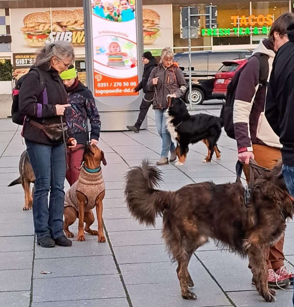 Wir sind ja eher nicht so die Stadtmenschen und wenn wir die Wahl haben, dann siegt als Ziel fast immer Wald und Wiese. Natürlich haben wir, gerade im Junghundealter, auch mit unseren Vierbeinern regelmäßig an belebten Plätzen, Straßen, Einkaufszentren usw. geübt. Wir bummelten oft durch den Pillnitzer Park, sind im Seniorenheim und regelmäßig in Gaststätten zu Besuch. Obwohl diese Dinge ganz selbstverständlich mit zum Alltag gehören und keinerlei Probleme bereiten, ist die belebte Innenstadt in Dresden, gemeinsam mit ca. 20 Hundekumpels und ihren Zweibeinern, noch einmal etwas ganz anderes.