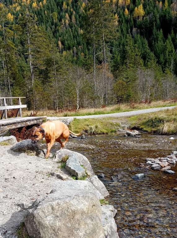 Ach ja, der Schlaf! Am Anfang ist er ständig gelaufen und hat bei uns im Schlafzimmer gelegen, hat bei jedem ungewohnten Geräusch sich auf die Fensterbank gestellt und aus dem Fenster geschaut. Wir haben hier ja eine ziemliche Geräuschkulisse von Wildtieren. Eule, Waldkauz, Fuchs und Waschbär rauben ihm jetzt nicht mehr den Schlaf. Er schläft die Nacht tief und fest und bleibt auch liegen, wenn ich um 4 oder 5 Uhr aufstehe. Nur einmal hat er sich unbemerkt ins Bett gemogelt. Wir hatten so fest geschlafen und er ist so leise und vorsichtig gewesen, da hatten wir erst am Morgen gemerkt, dass er in der Besucherritze geschlafen hat. Aber bei dem einem Mal ist es aber auch geblieben.
