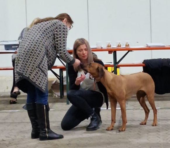 In Westhausen freuten wir uns auf Nalas und Katjas Ausstellungseinstieg. Gerade beim ersten Mal ist die Aufregung für Zwei- und Vierbeiner besonderes groß. Aber die Bewertung durch Herrn Klopsch fiel schon mal prima aus.
