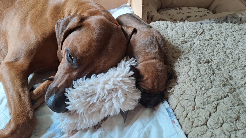 Hier wird ganz bewusst der Knabberspaß vor Neo und Umoja demonstriert. Bei zu großem Interesse der Jungspunde, erfolgte ein deutliches Knurren. Als dies das 2. Mal ignoriert wurde, gab es einen blitzschnellen Abschnapper, der in Geschrei und Flucht, aber ohne jeglichen Kratzer, endete. Am nächsten Tag wurde respektvoll von der Decke zugeschaut, wie es den erwachsenen Ridgebacks schmeckt. Es bestand kein Diskussionsbedarf mehr. Ja, da können wir von unseren Vierbeinern lernen...