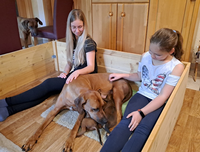 Als dann am 5. April, ein Rüde und eine kleine Hündin, durch Kaiserschnitt gesund zur Welt kamen, waren wir überglücklich.