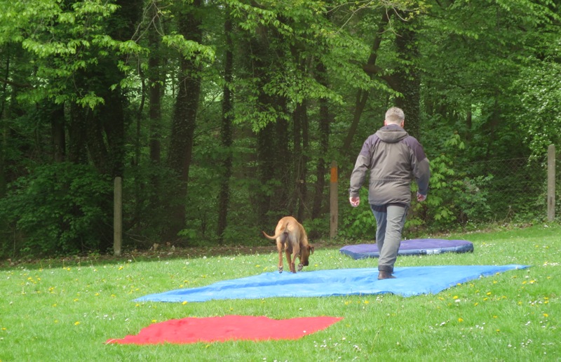 Der Parcours musste ohne Leine im "Fuß" ! absolviert werden und führte über verschiedene Untergründe, wie Planen und Luftmatratzen. Bei diesem Test wird die Kooperationsbereitschaft, die Führung und Bindung zum Hundeführer überprüft.