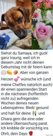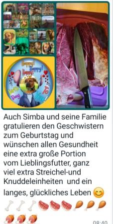 Wir wünschen unserer Chiara und ihren Geschwistern ein gesundes neues Lebensjahr mit vielen schönen Momenten. Habt Spaß mit euren Zweibeinern und lasst euch so richtig verwöhnen. Wir freuen uns über eure Erlebnisse in Wort und Bild und werden gern davon berichten.