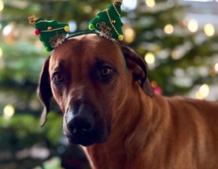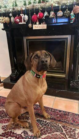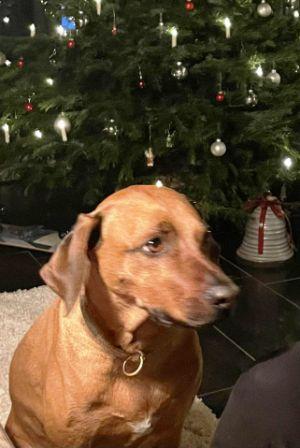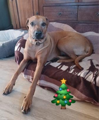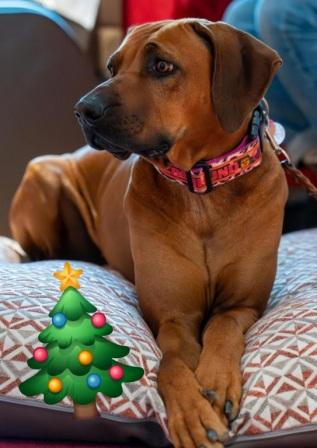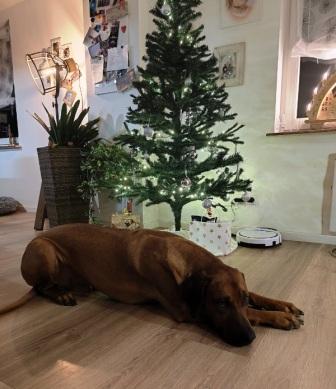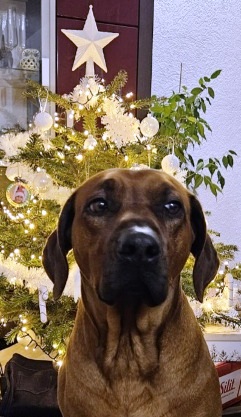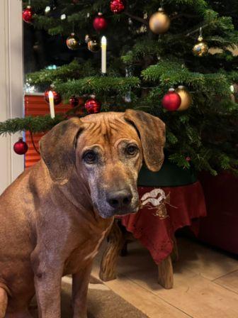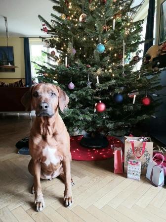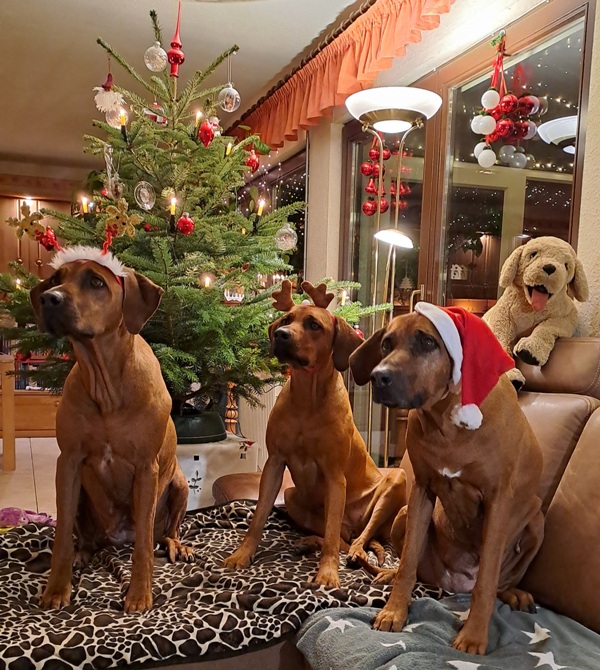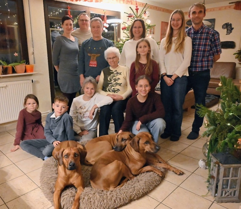 12 Zweibeiner und 3 Ridgebacks - bitte JETZT recht freundlich :-) ! Wenn die Enkel weiter so wachsen, dann muss im nächsten Jahr der Baum höher sein...