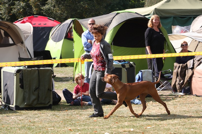 Wir verbrachten, mitten in der Natur, eine wunderschöne Urlaubswoche in Meezen. www.waldhuetten.de und verbanden dies mit der Internationalen Ausstellung in Neumünster. Aluna startete mit ihren 10 Monaten erstmals in der Jugendklasse und wurde von Herrn Klopsch gerichtet. Sie war damit die kleinste und jüngste Hündin in dieser Klasse und erzielte ein " Sehr Gut". Der Richterbericht war ausführlich und darin wurden die sehr gute Brusttiefe, die deutlich erkennbare Vorbrust und ihr sehr guter raumgreifender Bewegungsablauf erwähnt. Herr Klopsch meinte, sie bräuchte für ihre Entwicklung noch etwas mehr Zeit...